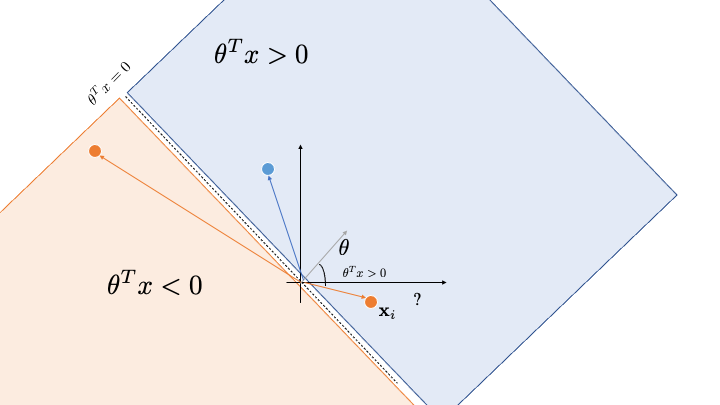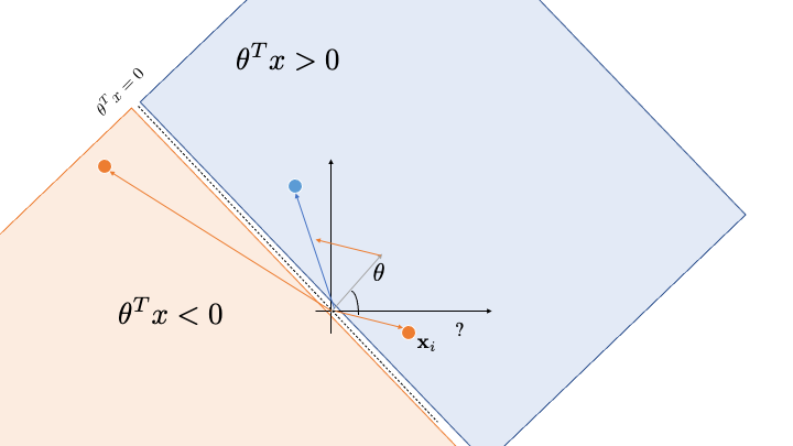 the angle is less than 90 deg, change $\theta \leftarrow \theta-\gamma\mbf{x}$the angle is more than 90 deg, change $\theta \leftarrow \theta+\gamma\mbf{x}$