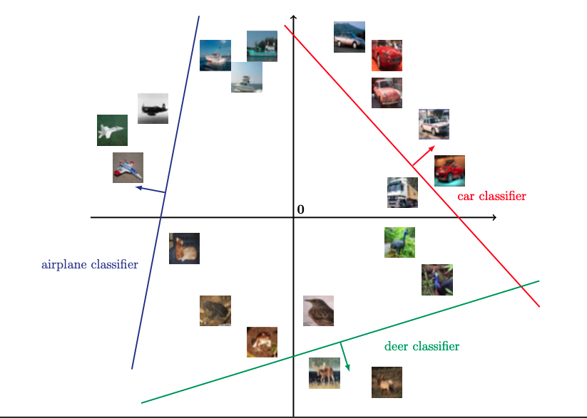 $$f_k(\hat{\mbf{x}}) > f_j(\hat{\mbf{x}}) \quad \forall j\neq k$$Decision boundary $\{\mbf{w}_k,b_k\}_{k=1}^K$ per class given K classes.
