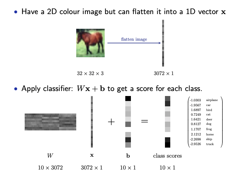 $$ \underbrace{\mbf{y}}_{\mathbb{R}^{Kx1}} = \underbrace{\mbf{W}}_{\mathbb{R}^{K\times d}}\underbrace{\mbf{x}}_{\mathbb{R}^{d\times1}} + \underbrace{\mbf{b}}_{\mathbb{R}^K}$$Will this work?