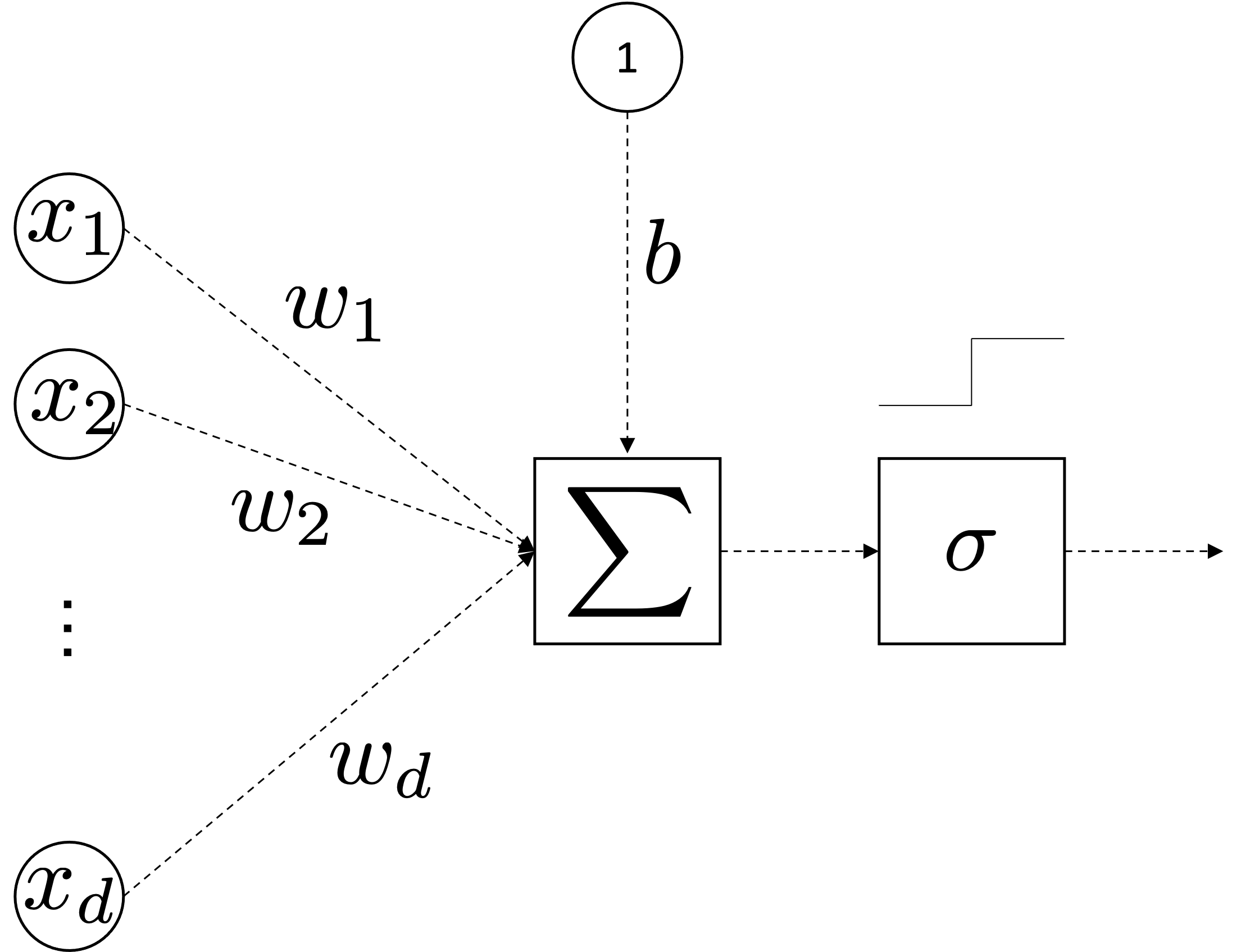 $$ \sigma(\mathbf{W} \mathbf{x} + \bmf{b})=\sigma \circ\left(\begin{array}{cccc} w_{11} & w_{12} & \cdots & w_{1 d} \\ w_{21} & w_{22} & \cdots & w_{2 d} \\ \vdots & \cdots & \ddots & \vdots \\ w_{k 1} & w_{m 2} & \cdots & w_{k d} \end{array}\right)\left(\begin{array}{c} x_{1} \\ x_{2} \\ \vdots \\ x_{d} \end{array}\right)+ \left(\begin{array}{c} b_{1} \\ b_{2} \\ \vdots \\ b_{k} \end{array}\right) =\sigma \circ\left(\begin{array}{c} z_{1} \\ z_{2} \\ \vdots \\ z_{k} \end{array}\right) $$