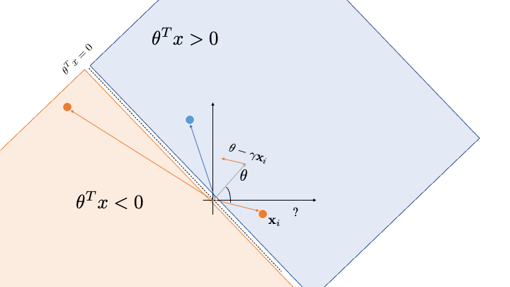 the angle is less than 90 deg, change $\theta \leftarrow \theta-\gamma\mbf{x}$the angle is more than 90 deg, change $\theta \leftarrow \theta+\gamma\mbf{x}$