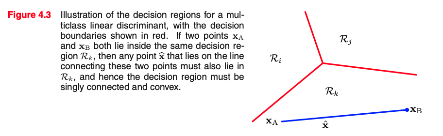 $$ \begin{align} (\mbf{w}_{k}-\mbf{w}_{j})^T{\mbf{x}_A} + (b_{k}- b_{j}) > 0 \quad \forall j\neq k\\ (\mbf{w}_{k}-\mbf{w}_{j})^T{\mbf{x}_B} + (b_{k}- b_{j}) > 0 \quad \forall j\neq k\\ \end{align} $$and also (definition of convexity): $$ \hat{\mbf{x}} = \lambda\mbf{x}_A + (1-\lambda)\mbf{x}_B ~~~\text{with}~~~~ 0 \le \lambda \le 1$$